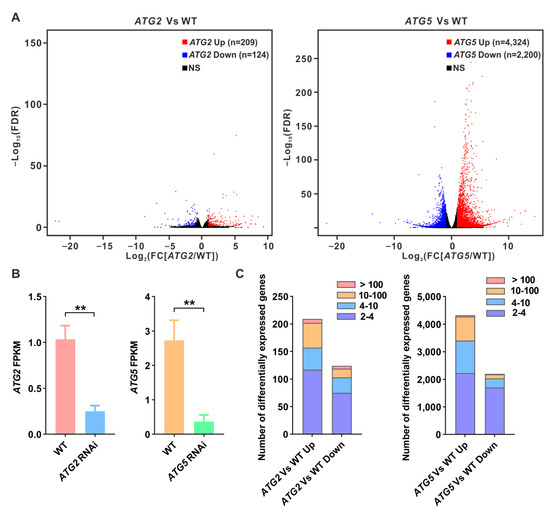 Identification of differentially expressed genes between WT and ATG-silenced pollen. (A). Volcano plots displaying differentially expressed genes between ATG2-silenced and WT pollen or ATG5-silenced and WT pollen. Red dots indicate upregulated genes, and blue dots indicate downregulated genes. (B). FPKM values of ATG2 and ATG5 in WT and their respective RNAi lines. (C). Number of differentially expressed genes between ATG2-silenced and WT pollen or ATG5-silenced and WT pollen. Fold changes are indicated with the distinct colors. Student’s t test, ** p < 0.05.