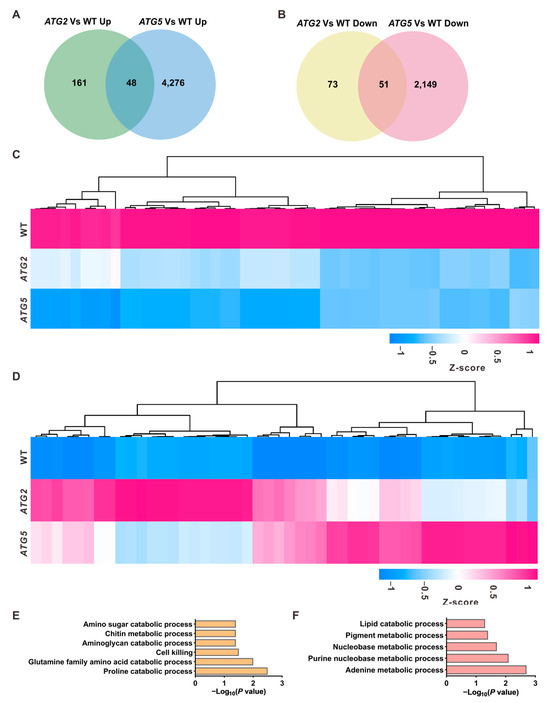 Identification of downstream pathways of autophagy in the process of pollen germination (A,B). Overlap analysis of upregulated genes (A) and downregulated genes (B) between ATG2/WT and ATG5/WT. (C,D). Heat maps showing the expression levels of the commonly downregulated (C) and commonly upregulated genes (D) in ATG2-silenced and ATG5-silenced pollen. (E,F). GO enrichment analysis of the commonly downregulated (E) and upregulated genes (F) in ATG2-silenced and ATG5-silenced pollen.