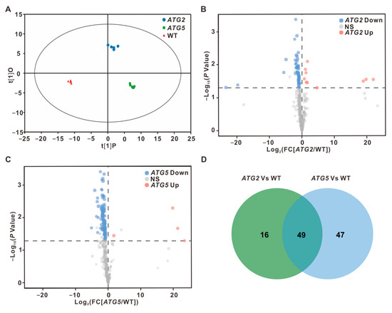 Silencing ATGs results in the decreased metabolite levels in pollen (A). OPLS-DA of metabolite levels. The ellipse represents the Hotelling T2 with 95% confidence. (B,C). Volcano plots showing metabolites with different abundances between WT and ATG-silenced pollen. Blue dots indicate downregulated metabolites in ATG-silenced pollen, while pink dots indicate upregulated metabolites in ATG-silenced pollen. (t-test, p < 0.05). (D). Venn diagrams showing the overlaps of metabolites with significantly different contents in ATG-silenced pollen.