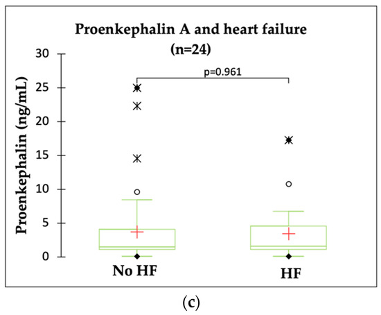 The echocardiography report was available in 60 (68%) patients and the NT-proBNP measurement was obtained in 56 (64%) patients. Based on standard criteria (see Section 4.2.) heart failure was diagnosed in 24 (28%) patients. Heart failure with reduced or mildly reduced EF accounted for only eight (33%) cases. The remaining 16 (66%) patients (for whom an echocardiography report was available) were diagnosed with HF with preserved EF. As depicted in Figure 2, Sperman’s rank correlation showed no correlation between PENK A and NT-proBNP (p = 0.949) (a). There was no significant difference in PENK A level between patients with varying EF (p = 0.361) (b). Similarly, no significant differences in PENK A levels were found between patients with or without HF (p = 0.961) (c).