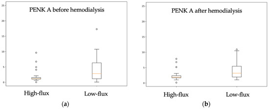 Figure presenting PENK A levels in patients treated with high-flux (boxplot on the left) and low-flux (boxplot on the right) hemodialysis membranes. PENK A concentration was significantly higher in patients using low-flux membrane vs. patients using high-flux membranes, both before hemodialysis (p = 0.003) and afterwards (p = 0.003): (a) PENK A levels in samples drawn directly before hemodialysis; (b) PENK A levels after hemodialysis.