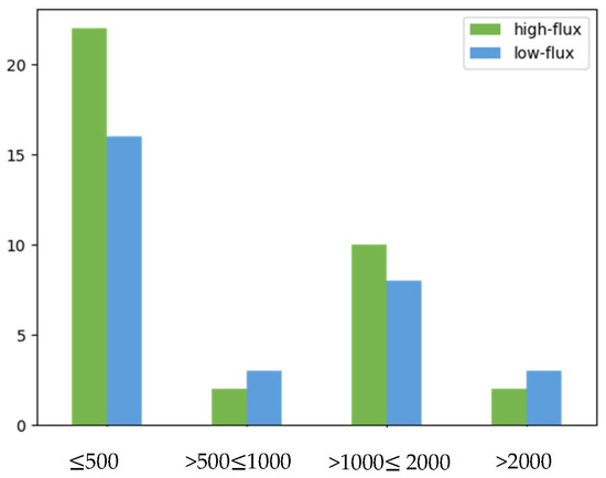 Figure presenting the distribution of residual urine output (mL/24 h) in patients treated with high-flux (green) and low-flux (blue) hemodialysis. No significant differences in residual diuresis were observed between the high-flux and low-flux groups (p = 0.793).