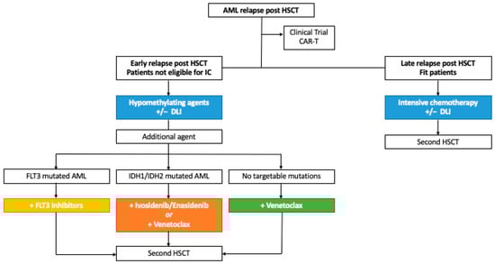 - Zucenka, A.; Vaitekenaite, V.; Maneikis, K.; Davainis, L.; Pileckyte, R.; Trociukas, I.; Peceliunas, V.; Zvirblis, T.; Staras, V.; Griskevicius, L. Venetoclax-based salvage therapy followed by Venetoclax and DLI maintenance vs. FLAG-Ida for relapsed or refractory acute myeloid leukemia after allogeneic stem cell transplantation. Bone Marrow Transpl. 2021, 56, 2804–2812. [Google Scholar] [CrossRef] [PubMed]