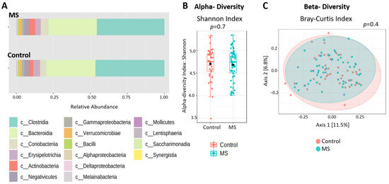Figure 1. General microbiome composition. (A): Relative composition at the class level. (B): Alpha-diversity between MS and HC calculated by Shannon index at the OTU level. (C): Beta-diversity between MS and HC calculated by Bray–Curtis dissimilarity at the OTU level. MS—multiple sclerosis.
