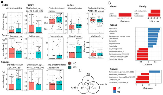Figure 2. Differential abundant taxa between PwMS and HCs. (A)—Representative graphs of taxa with significant difference in relative abundance, as determined by at least two out of three tools (DESeq2, MetagenomeSeq, and EdgeR) at different taxonomic levels (FDR < 0.1). Each black dot represents the relative abundance of a participant sample. (B)—Linear discriminant analysis (LDA) score of significant different taxa as determined by LDA effect size (LefSE) between PwMS and HCs at different taxonomic levels (p < 0.05). (C)—Venn diagram presenting the overlap of differentially abundant taxa identified in the analysis of all samples, Jewish participants or Arab participants. HC—healthy control, MS—multiple sclerosis.