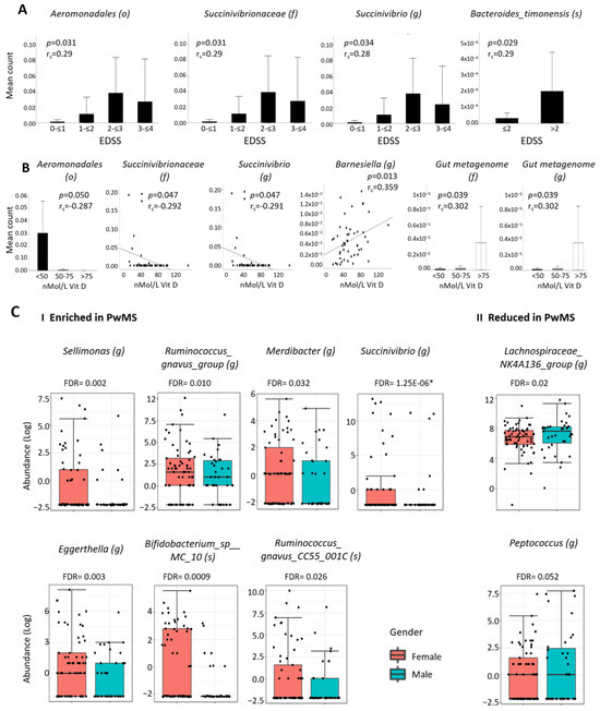 Figure 3. Associations between MS-differentially abundant microbiota, EDSS, vitamin D, and gender. (A)—Representative graphs of MS-differentially abundant taxa, which significantly correlates with EDSS (Spearman correlation, adjusted for BMI). (B)—Representative graphs of MS-differentially abundant taxa, which significantly correlates with serum vitamin D level shown as continuous or divided into 3 groups: <50 nMol/L—vitamin D insufficiency, 50–75 nMol/L—vitamin D mild deficiency, >75 nMol/L—vitamin D sufficient (Spearman correlation, adjusted for BMI). (C)—Representative graphs of MS-differentially abundant taxa enriched in PwMS (I) or reduced in PwMS (II), which differ significantly between females and males. Figure presents FDR calculated from EdgeR, * FDR from DeSeq2. Each black dot represents the relative abundance of a participant sample.