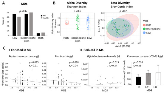 Figure 4. Correlations between MS-differentially abundant microbiota and dietary data. (A)—The distribution of adherence to a Mediterranean diet (MDS) in PwMS and HCs (Kruskal–Wallis test). (B)—Alpha-diversity Shannon index and beta-diversity Bray–Curtis dissimilarity according to high, low, or intermediate MDS (OTU level). (C)—Representative graphs of differentially abundant taxa, enriched in PwMS (I) or reduced in PwMS (II) which significantly correlates with MDS (Spearman correlation). MDS shown as continuous or divided into 3 groups (MDS low (1–6 points), intermediate (7–11 points), high (2–17 points). MDS—Mediterranean diet score.