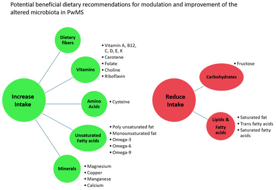 Analysis of the FFQ provides data on the estimated daily intake of 74 nutrients and energy. There was no difference in energy or nutrient intake between PwMS and HCs, besides alcohol intake, which was lower in PwMS (p = 0.032) (Table S2). Sub-analyses in Jewish or Arab participants separately or in female and male participants separately did not reveal additional differences in nutrient intake between PwMS and HCs (p = 0.039 in females, p > 0.05 for all other nutrients in females or males and in Jewish or Arab participants). Out of the 40 identified MS-differential taxa, significant correlations were found between the abundance of 25 taxa and 44 nutrients (Table S3). These included mostly vitamins and unsaturated fatty acids, but also amino acids, minerals, carbohydrates, lipids, saturated fatty acids, etc. Several correlations indicate that modification of the daily intake of specific nutrients could have a beneficial influence on the abundance of taxa altered in PwMS. For example, increased intake of various vitamins including vitamin B12, vitamin K, vitamin E, carotene, vitamin A, choline, and folate correlated negatively with the abundance of several microbiota enriched in PwMS, such as the genera Eggerthella, Flavonifractor, Negativibacillus and Mitsuoke, while vitamin C, D, and riboflavin (vitamin B2) correlated positively with genus Lachnospiraceae UCG-004, which was reduced in PwMS. Increased intake of minerals such as magnesium, copper, and manganese correlated negatively with the abundance of microbiota such as those of the Peptostreptococcaceae family or the genera Romboutsia, Flavonifractor, or Negativibacillus, all enriched in PwMS, while increased intake of the amino acid cysteine correlated positively with genus Lachnospiraceae UCG-004, which was reduced in PwMS. Higher intake of polyunsaturated fat, omega-3, omega-6, and omega-9 fatty acids, or Docosapentaenoic acid (DPA) correlated negatively with the abundance of PwMS-enriched microbiota such as the genera Eggerthella, Flavonifractor, or Mitsuokella. In contrast, trans fatty acids, saturated fat, and saturated fatty acids correlated positively with taxa enriched in PwMS, such as the species Ruminococcus gnavus CC55_001C, and correlated negatively with the abundance of taxa reduced in MS, such as those of the genus Ruminococcaceae UCG-013 or the species uncultured Clostridium spp. and Bacteroides timonensis. A summary of 15 significant correlations, which support the concept that modifications of nutrient intake may “repair” altered abundance of specific taxa in PwMS, is presented in Table S4. Based upon these findings, in Figure 5, we present suggested dietary changes with the potential of beneficially modulating dysbiosis in PwMS and restoring a healthy microbiome. These are preliminary suggestions of focus for further research and exploration, presented with caution, since, in some cases, these nutrients also correlated oppositely with other altered microbiota, opposing “a repair” of dysbiosis.