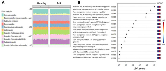 Figure 6. Predicted functional pathways. (A). Main KEGG metabolism pathways in the MS and healthy control cohorts (B). KOs discriminating between PwMS and HCs according to LEfSe at FDR < 0.1. KEGG—Kyoto Encyclopedia of Genes and Genomes, LEfSe: linear discriminant analysis effect size.