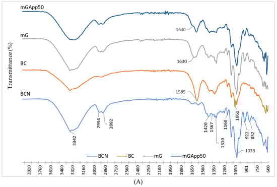In the BCN spectrum, the absorption bands are observed in two wave number regions: 3600–2800 cm−1 and 1700–600 cm−1 (Figure 3A). A strong broad band can be observed in the wave number range of 3600–3000 cm−1, which is assigned to different O–H stretching vibration polysaccharides. In this broad band there is a distinguishable peak at 3342 cm−1 that is described in the literature as corresponding to the strength of the intramolecular 3OH⋯O5 intramolecular hydrogen bond [30], and it can be observed in the spectra of BCN, BC, and mG, but is not detected in mGApp50. In the absorption band range of 2880–2930 cm−1, there is a peak is assigned to the C–H bending bonds. Also, characteristic peaks of cellulose at 1420 and 1310 cm−1 represent the symmetric stretching and out-of-plane wagging of the CH2 groups, respectively [30]. The absorption bands at 1367 cm−1 belong to vibrations of –CH. Characteristic for carbohydrates’ IR signals in the region of 1160–1033 cm−1 corresponding to the C–O–C antisymmetric bridge stretching of β-1,4-glycosidic bond, C–C, and C–O stretching vibrations, C–O–H bending and C–O–C pyranose ring skeletal vibration can also be observed. The changes in the structure of the native cellulose caused by pretreatment can be seen in an intense band with the pick at 1585 cm−1 wavenumbers. The pick corresponds to carboxylate antisymmetric stretching bands (COO−). Apparently, treatment with hydrogen peroxide caused oxidation, and COO− groups were formed. Further modification of BC by glycerol affected this band, as can be seen in the spectrum of mG where this band has a much lower intensity, and a new peak can be observed at slightly higher wavenumbers. The main bands in the mG spectrum are also present in the mGApp50. However, differences in the absorption band intensities in spectra-modified cellulose samples are observed. Comparing the FTIR spectra before and after modification of the bacterial cellulose with apple powder, the band at the wavenumber 3340 cm−1 corresponding to O-H bond stretching was more curved, indicating changes in the intensity value. That observation is in accordance with the literature and could be related to the interlinkage of pectin and BC fibers through H bonding [31]. Concurrently, there was an intensity increase of the C-H bending bond in the range of 2990–2800 cm−1 wavenumbers showing intramolecular bonds. The changes observed in the BC spectra suggest that both modifiers were incorporated in the structure of BC as a result of chemical interactions between cellulose and glycerol and as well between pectin.