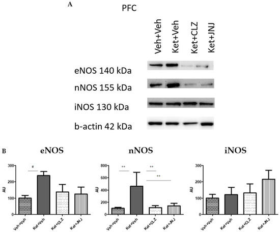 Effect of CLZ and JNJ treatments on protein levels of NOS isoforms in the PFC of SZ-like mice induced with Ket. (A) Representative densitometry blots of eNOS, nNOS, and iNOS isoforms in the PFC tissue from the different groups of study, including vehicle controls, SZ-like mice induced with Ket, and Ket-induced mice treated with CLZ or JNJ. The upper panels show the three protein isoforms of interest, and the lower panel represents the corresponding housekeeping β-Actin. (B) Protein levels of the three NOS isoforms (eNOS, nNOS, and iNOS) were estimated by quantification of densitometry blots (AU). Both eNOS and nNOS increased in the Ket-induced group compared to the vehicle and decreased in the CLZ and JNJ treated groups, although the decrease associated with the pharmacological treatments was only significant in the neuronal isoform. The iNOS isoform did not lead to significant differences among the groups of study. # p = 0.07, ** p < 0.01 (AU, arbitrary units; CLZ, clozapine; eNOS, endothelial nitric oxide synthase; iNOS, inducible nitric oxide synthase; JNJ, JNJ-46356479; Ket, ketamine; NOS, nitric oxide synthase; nNOS, neuronal nitric oxide synthase; PFC, prefrontal cortex; Veh, vehicle).