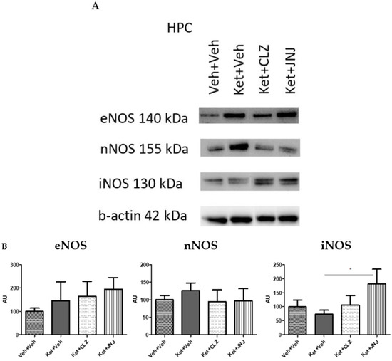 Effect of CLZ and JNJ treatments on protein levels of NOS isoforms in the HPC of SZ-like mice induced with Ket. (A) Representative densitometry blots of eNOS, nNOS, and iNOS isoforms in the HPC tissue from the different groups of study, including vehicle controls, SZ-like mice induced with Ket, and Ket-induced mice treated with CLZ or JNJ. The upper panels show the three protein isoforms of interest, and the lower panel represents the corresponding housekeeping β-Actin. (B) Protein levels of the three NOS isoforms (eNOS, nNOS, and iNOS) were estimated by quantification of densitometry blots (AU). No significant differences were obtained in the protein levels of eNOS and nNOS isoforms. Protein levels of the inducible iNOS isoform significantly increased in the Ket-induced group treated with JNJ compared to the Ket-induced SZ-like group. * p < 0.05 (AU, arbitrary units; CLZ, clozapine; eNOS, endothelial nitric oxide synthase; HPC, hippocampus; iNOS, inducible nitric oxide synthase; JNJ, JNJ-46356479; Ket, ketamine; NOS, nitric oxide synthase; nNOS, neuronal nitric oxide synthase; Veh, vehicle).