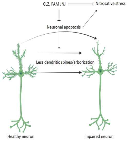 Antipsychotic compounds CLZ and mGlu2r PAM JNJ, among others, may halt both neuronal local apoptosis related to dendritic spines and arborization and subsequent nitrosative stress. CLZ, clozapine; PAM, positive allosteric modulator, JNJ, JNJ-46356479.