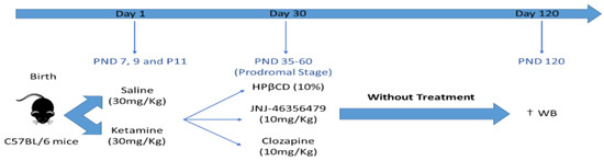 Design of the study. On PND 7, 9, and 11, the C57BL/6J mice were treated with either saline or 30 mg/kg ketamine. This is a study conducted in the prodromal stage of the disease, from 35 to 60 PND, when HPβCD, CLZ, or JNJ were administered daily. On PND 120, mice were sacrificed, and tissues were obtained for further analysis. HPβCD, hydroxypropyl-beta-cyclodextrin; JNJ, JNJ46356479; PND, postnatal days; WB, western blot. † day of sacrification.