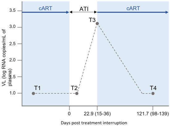The clinical trial included an ART treatment interruption (ATI), which was considered day 0. Peripheral blood mononuclear cells (PBMCs) were collected prior to ATI at T1 (at undetectable VL), at T2 (7–15 days post ATI, undetectable VL), T3 (viral rebound) and T4 (3 months after cART reinitiation) (Figure 1). Patients were monitored twice a week following ATI to assess VL and potential rebound. Upon rebound, cART was immediately restarted. Viral rebound was defined as a VL > 1000 copies/mL or two consecutive VL > 200 copies/mL measurements.