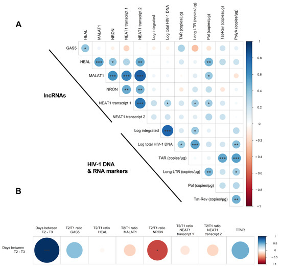 Correlation between lncRNA expression and HIV-1 markers. (A) Correlation plot indicating the correlation between lncRNA expression and HIV-1 viral DNA and RNA markers in participants undergoing ATI. Spearman correlations were calculated at all timepoints and included all participants. (B) Spearman correlation between lncRNA fold change expression (between T2 and T1) and the days from T2 to viral rebound. Positive and negative correlations are depicted in blue and red, respectively. Significant correlations are indicated with asterisks (p < 0.05 *, p < 0.01 ** and p < 0.001 ***).