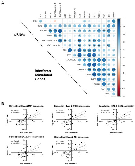 Correlation of lncRNA expression and the expression of interferon stimulated genes. (A) Correlation plot indicates the correlation between lncRNA expression and the expression of ISGs in participants undergoing ATI. Spearman correlations were calculated over all timepoints, including all participants. Positive and negative correlations are depicted in blue and red, respectively. Significant correlations are indicated with asterisks (p < 0.05 *, p < 0.01 ** and p < 0.001 ***). (B) Spearman correlation plot of the expression of HEAL and restriction factors observed to be upregulated in previous work [18]. In all plots the Spearman r is reported, as well as the p-value.