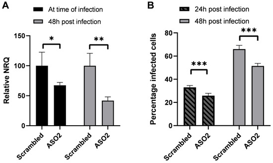 To assess the potential direct role of HEAL during HIV-1 infection and replication, we knocked down HEAL expression through an antisense oligo that was delivered via gymnosis to SupT1 cells. Expression levels at the moment of infection and 48 h post infection were reduced by 32.6% and 58.1%, respectively, compared to cells treated with a scrambled ASO control (Figure 5A). This knockdown induced a significant reduction in HIV-1 infection of 21.9% (p = 0.0006) 24 h post infection and 22.0% (p = 0.0002) 48 h post infection (Figure 5B), confirming previous reports that HEAL directly promotes HIV-1 replication [13]. As we used full-length NL4.3-GFP virus, infection levels at 48 h also reflect virus spread in the culture due to a second viral replication round.