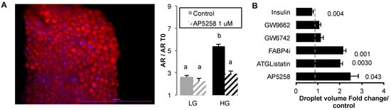 Whether fatty acid/FAT/CD36 signalling pathways were involved in the regulation of cell size was monitored in 2D cell cultures (Figure 1B). The 3T3-L1 adipocytes were treated with a low dose of oleic acid in HG culture media in presence of several inhibitors at optimized concentrations over 3 days. Fatty acid uptake is a fast event and this protocol was previously optimized in order to avoid cell detachment or toxicity, given the time for synthesis of the proteins required for lipid accumulation and droplet size increase. This means also that in such experiments, important cell reorganization could be observed, such as basal lipolysis and fatty acid exchange between adipocytes [23]. As previously observed, insulin reduced the effect of OA on droplet size increase. Inhibition of PPARG (by GW9662) or PPARA (by GW6471) did not have any significant effect, suggesting that their regulation by FAT/CD36 was not involved in these conditions. However, inhibition of FAT/CD36 (by AP5258), together with those of ATGL (by ATGListatin) and intracellular FABP4 (by FABP4i), were related to an increase of droplet size in 3T3-L1 cells. This result shows that ATGL-dependent lypolysis, FAT/CD36, and FABP4 play a major role in the regulation of cell size.
