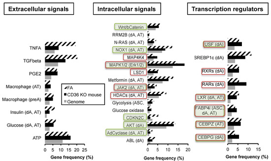 The regulation of adipocyte size proceeds through the transcriptional induction of genes involved in fatty acid storage. We previously found that oleic acid is a major activator of FAT/CD36—PPARG signalling pathway [12,23]. Whether FAT/CD36 inactivation regulates gene transcription was analyzed using comparative analyzes of gene datasets. The gene dataset regulated by fatty acids was compared to the gene datasets regulated by FAT/CD36 knock-out. The method consists in comparing significant enrichment of genes (genome as reference) [12,23]. Although the datasets are obtained from experiments performed in different conditions and on different kinds of samples, previous studies have shown that significant enrichments in gene datasets allow the identification of signalling pathway crosstalks. A pairwise comparison of gene datasets regulated by either fatty acids or in FAT/CD36 knock-out mice was performed. Both gene datasets were compared to human gene datasets regulated by a series of either extracellular signals, intracellular pathways, or transcriptional regulators. In another way, their relevance to adipose phenotype, i.e., to signalling pathways, is significantly over-represented in either adipose stem cells (ASCs), in vitro differentiated adipocytes (dA), or adipose tissue (AT) datasets has been analyzed (Suppl Table S1). Only signalling pathways significantly over-represented in both fatty acid and FAT/CD36 knock-out gene datasets are presented in Figure 2.