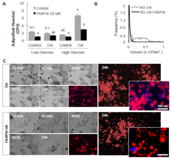 FABP4 is required to induce droplet size increase. (A). 3T3-MBX adipocytes treated during 24 h in low glucose (LG, 1 g/L), high glucose (HG, 4.5 g/L) with or without OA (10 μM) and or inhibitor of FABP4 (FABP4i 20 μM) then analyzed by image quantification of Adipored and Hoechst (n = 8 biological replicates). (B) Multisizer cell size distribution validates the inhibitory effect of FABP4i on cell size increase (n = at least 5000 cells). Significant differences are represented by letters (ANOVA test p-values p < 0.05). (C) Real-time imaging in high glucose media then merged AdipoRed (red) and Hoechst 33258 (blue), left panel, and representative images at ×4 and ×20 (right panel).