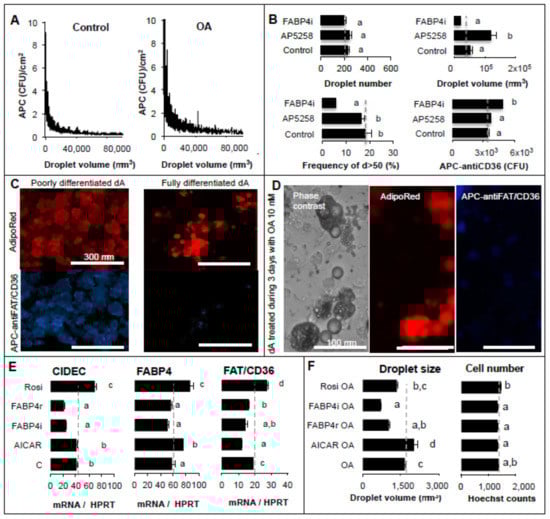 FAT/CD36 expression and activity in adipocytes. (A–D) The active form of FAT/CD36 was detected using an APC-coupled antibody directed against the extracellular part of the protein (blue color). Lipid droplets were labeled with AdipoRed (red color) and analyses were performed on 3T3-L1 adipocytes 3 days after treatment with oleic acid 10 μM: (A) Distribution of extracellular FAT/CD36 co-localized with lipid droplets (env. 5000 counts) is inversely regulated with droplet size. (B) Inhibitors of FAT/CD36 (AP5258 1 μM) and FABP4 (FABP4i 20 μM) did not affect droplet number (upper left panel), inhibition of FAT/CD36 promoted the increase of droplet size (upper right panel) although inhibition of FABP4 reduced the frequency of droplets with size up to 50 μm (lower left panel) and increased extracellular FAT/CD36 (lower right panel). (C) AdipoRed and APC-FAT/CD36 antibody detection on poorly vs. highly differentiated adipocytes and (D) in OA-treated adipocytes. (E) Gene transcription analysis of 3T3-MBX adipocytes treated over 3 days with oleic acid 5 μM in order to induce adipogenic genes, then 48 h, with either recombinant FABP4r (20 ng/mL), an inhibitor of FABP4 (FABP4i 20 μM), AMPK activator (AICAR 1 mM) or PPARG activator (rosiglitazone (20 μM). The effects on gene transcription for CIDEC, FABP4, and FAT/CD36 were normalized to the standard HPRT gene. Results are presented as mean +/− SEM: n = 8 biological replicates with 3 images at objective ×4 per sample in (B,F), mean +/− SD in (E) (n = 4 replicates). (F) Then their capacity to increase droplet size (left panel) without significant effect on cell number (right panel) was assessed 3 days after treatment with oleic acid (OA 10 μM). (E) Results are presented as mean +/− SEM (n = 8 biological replicates). Different letters represent significant differences (Anova, p < 0.05).