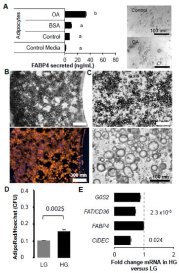 FABP4 is secreted by adipocytes during lipolysis. Human adipocytes were treated with oleic acid over 48 h in order to increase droplet size (Figure 5A). Fatty acid uptake is a fast event. Forty-eight hours after treatment with OA, an accumulation of FABP4 in culture media was detected. This observation suggests that basal lipolysis occurred in high glucose culture media.