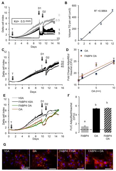 Extracellular Fatty acid binding protein 4 (FABP4) inhibits oleic acid (OA)-induced adipogenesis in human adipose stem cells (ASCs). At time (T) human ASCs were exposed during proliferation to OA complexed to human albumin (hSA) (A,B), recombinant FABP4 at several doses (C,D), or hSA 1%, OA 10 μM and/or FABP4 20 ng/mL (E–G), then differentiation was induced (D1 and D2). The effect of OA on differentiation was revealed by the dose-dependent effect on cell adhesion force monitored as a cell index normalized at the time cells were loaded. (A) Real-time monitoring of cell index (representing adhesion force) shows the dose-dependent promoting effect of oleic acid on adipogenesis, i.e., reduction of cell adhesion force after induction of differentiation for OA doses up to 0.5 μM, (B) validated by quantification at the end of the experiment of the mean droplet cell size (droplet count normalized to nuclei counts) on ×4 images. (C) Real-time monitoring of adipogenesis in presence of FABP4 at several doses shows no significant effect. (D) TG accumulation (AdipoRed fluorescence intensity normalized to cell number) due to OA uptake is independent of OA complexation to hSA versus FABP4. (E) Real-time monitoring of adipogenesis shows that although OA complexation to hSA improved adipogenesis (reduction of cell index after induction of differentiation), its complexation to FABP4 inhibited adipogenesis (an increase of cell adhesion after induction of differentiation), (F) without affecting accumulation of TG detected as described in (D). (G) Representative micrographs of merged Adipored (red) and Hoechst 33258 (blue) human cells at the end of experiments. Data are presented as mean +/− SEM and letters represent significant differences (n = 8 biological replicates, ANOVA test, p < 0.05) in (F).