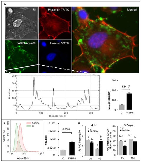 Fatty acid binding protein 4 (FABP4) uptake and regulation of active FAT/CD36 form in 3T3-MBX cells (A) Nanolive imaging after 3 h treatment with Atto488-FABP4 (FABP4r 100 ng/mL) and quantification of max Atto488 intensity per cell. (B) Atto488-FABP4 quantification by cytometry. (C) Effect of FABP4r on extracellular FAT/CD36 detected with APC-coupled anti-FAT/CD36 antibody after 4 h and after 3 days. Data are presented as mean values +/− SEM (n = 10 cells in A, 8 biological replicates in (B,C)) with significant differences indicated by Student t-test p-values in (A,B), and different letters in (C) (Anova test p-values < 0.05).