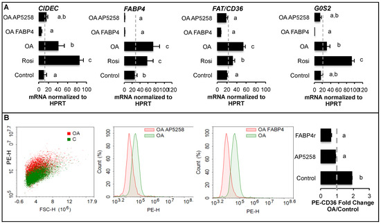 Fatty acid binding protein 4 (FABP4) inhibits the pro-adipogenic programme mediated by fatty acid/FAT/CD36 pathways in 3T3-L1 fibroblasts. Treatments were performed in DMEM high glucose media over 24 h with oleic acid (OA 0.5 μM), recombinant FABP4 (FABP4 20 ng/mL), FAT/CD36 inhibitor (AP5258, 1 μM) or rosiglitazone (Rosi 10 μM). (A) Gene transcription analyses by qRT-PCR, normalized to HPRT standard, show the inhibitory effect of FABP4 and FAT/CD36 inhibition on their own induction by OA. (B) Phycoerythrin (PE)-coupled anti CD36 antibody was analyzed by cytometry and showed that both FABP4r and FAT/CD36 inhibitor reversed the induction of extracellular FAT/CD36 by OA. Data are presented as mean values +/− SEM ((A): n = 8 biological replicates, (B): 4 replicates; at least 5000 cells/sample) with significant differences represented by letters (ANOVA p-values < 0.05).