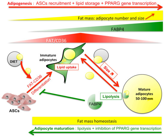 Regulation of adipocyte size requires (1) increased fatty acid storage through lipid uptake and (2) high PPARG transcriptional activity for the synthesis of major pro-adipogenic markers FAT/CD36 and FABP4. A finely tuned management of lipid uptake, storage, and release has been found to be orchestrated by the regulation of PPARG transcriptional activity and AMPK mediated antilipolytic activity through a finely tuned regulation of FAT/CD36 signalling by FABP4 (Figure 9). Although FABP4 is required for adipogenesis, its accumulation by either retention in non-lipolytic adipocytes or uptake in adipogenic precursors may induce a negative control of respectively, size increase resulting in homogenization of adipocyte size, and fatty acid-induced adipogenesis involved in the recruitment of new adipocytes. This hypothesis is in accordance with the observation that FABP4 lack is associated with increased body weight, as well as an increase in body fat without changes in glucose concentration or lipid homeostasis [56]. Thus, FABP4 is a major controller of fatty acid-induced FAT/CD36 mediated regulation of adipose tissue homeostasis by FAT/CD36 signalling.