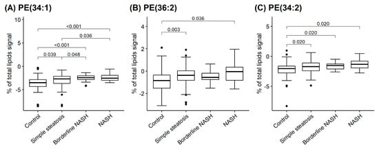 Based on our results, a remarkable change was observed in serum PLs that varied significantly between SS, B-NASH and NASH subjects in obese individuals. The most dramatically changed PL species and their ratios observed in our study were CE, PE, LPC/PE, and LPC/CE. As demonstrated in Figure 1, increased levels of three specific PEs and CE while decreased ratios of LPC/PE were associated with the disease progression. Our data showed a distinguishable increase in PE species containing saturated fatty acid (SFA) and monounsaturated fatty acid (MUFA) in NAFLD subjects compared to control. The elevation of MUFA/SFA containing PLs may be due to increased insulin secretion as well as high dietary intake in obese subjects [30] which consequently activates de novo lipogenesis and accumulation of MUFA/SFA PLs fraction in blood [25,31].