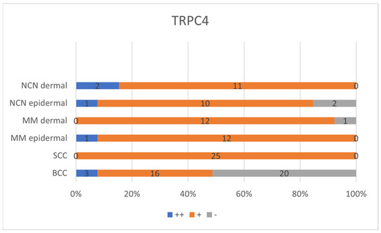 Kurz, B.; Michael, H.P.; Förch, A.; Wallner, S.; Zeman, F.; Decking, S.-M.; Ugele, I.; Hintschich, C.; Haubner, F.; Ettl, T.; et al. Expression of pH-Sensitive TRPC4 in Common Skin Tumors. Int. J. Mol. Sci. 2023, 24, 1037. https://doi.org/10.3390/ijms24021037