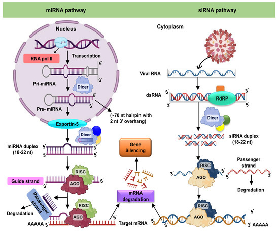 Mechanism of RNA interference in plant cells. The miRNA pathway, on the left, starts in the nucleus via transcription, resulting in the helix folding primary miRNA (pri-miRNA). Dicer first cleaves the pri-miRNA in the nucleus to produce the precursor miRNA (pre-miRNA), which Dicer then cleaves to produce the roughly 22-nucleotide miRNA duplex. The duplex is transported into the cytoplasm and loaded into the RISC. In RISC, one strand of the miRNA duplex (the passenger strand) is eliminated while another strand (the guide strand) is maintained. When the RISC-bound guide RNA attaches to a target RNA, it causes cleavage or translational arrest. When a target RNA (typically a structural aberrant RNA or those from an infected plant virus, as in this case) is detected by Dicer, the target RNA is cleaved into short (21–24 nucleotide) duplex RNAs. In the case of duplex miRNAs, one strand (the passenger) is delivered and degraded while the other (the guide RNA) is maintained by RISC. Cleavage occurs whenever the RISC-bound guide RNA attaches to a target RNA. The RNAi response within the cell can be amplified by RNA-dependent RNA polymerase activity. AGO: Argonaute protein; DCL: Dicer-like protein; RISC: RNA-induced silencing complex; RdRP: RNA-dependent RNA polymerase; RNAi: RNA interference.