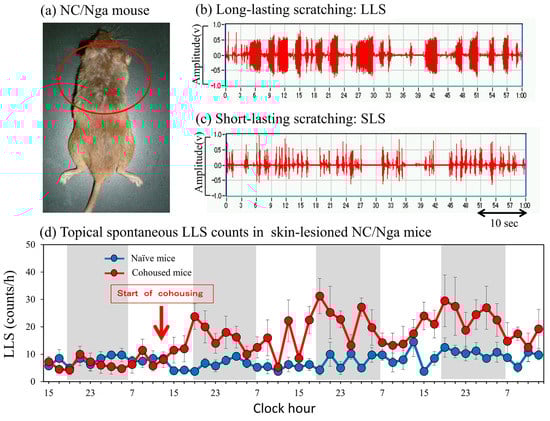 Scratching behavior of skin-lesioned NC/Nga mice. (a) Skin−lesioned NC/Nga mice, an animal model of atopic dermatitis. NC/Nga mice with spontaneous skin lesions frequently scratch their faces, ears, and rostral parts of their backs (inside the red circle) using their hind paws. Dermatitis also does not develop in the lower part of the mouse body, which is not accessible to its hind paws. (b) Representative form of long-lasting scratching (LLS, scratching behavior that lasts more than 1.5 s, itch-associated scratching behavior). (c) Representative form of short-lasting scratching (SLS, scratching behavior that lasts from 0.3 to 1.5 s, associated hygiene behavior). (d) LSL counts of SPF-NC/Nga mice cohoused with skin-lesioned NC/Nga mice. Red arrow indicates the start of cohousing with skin-lesioned NC/Nga mice, the lateral axis indicates the clock hour, and the shaded area represents nighttime (dark phase, 7:00 p.m. to 7:00 a.m.).