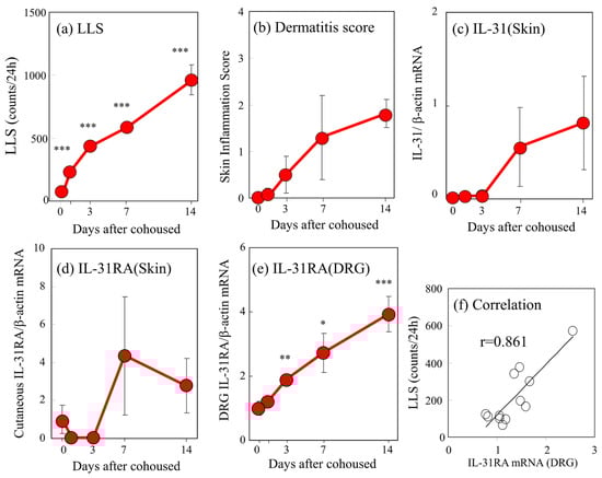Time-course changes in long-lasting scratching (LLS), dermatitis score, cutaneous interleukin-31 (IL-31) and IL-31 receptor A (IL-31RA) mRNA expression, and dorsal root ganglion (DRG) neuronal IL-31RA mRNA expression in SPF-NC/Nga cohoused with skin-lesioned NC/Nga mice. (a) LLS (over 1.5 s) in NC/Nga mice was measured after 1–14 days. (b) Dermatitis score was based on the severity of erythema/hemorrhage, edema, excoriation/erosion, and scaling/dryness. (c) Cutaneous IL-31 mRNA/β-actin mRNA expression ratio. (d) Cutaneous IL-31RA mRNA/β-actin mRNA ratio. (e) DRG neuronal IL-31RA mRNA/β-actin mRNA expression ratio. (f) Correlation between the DRG neuronal IL-31RA mRNA expression ratio and the LLS counts in NC/Nga mice. Neuronal IL-31RA mRNA/β-actin mRNA expression ratio in SPF-NC/Nga mice cohoused with skin-lesioned NC/Nga mice for 3, 7. and 14 days was measured as described in the text. The values represent the means ± standard error (S.E.) from six mice. * p < 0.05, ** p < 0.01, *** p < 0.001 compared with pre-cohoused values of SPF-NC/Nga mice (Student’s t-test with Bonferroni correction).