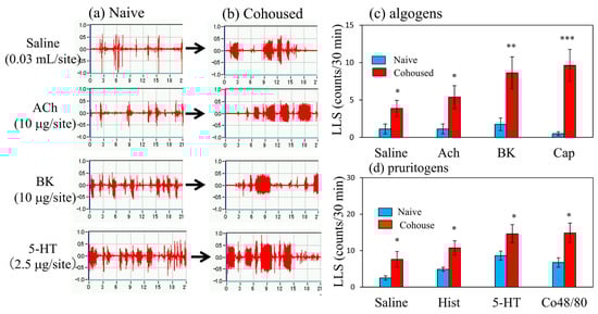 Cohousing of BALB/c mice with skin-lesioned NC/Nga mice for 6 days caused itchy skin. Figure 3 shows saline-, acetylcholine-, bradykinin-, and serotonin-induced scratching behavior in the mice with itchy skin. These stimulants elicited many SLS counts, and few LLS counts in the naïve mice (Figure 3a). In contrast, the LLS counts were increased in the mice with itchy skin (Figure 3b). In the naïve mice, saline and algogens, such as acetylcholine, bradykinin, and capsaicin, elicited SLS but not LLS (Figure 3c, blue column). In addition, pruritogen, saline, histamine, serotonin (5-HT), and compound 48/80 elicited SLS but not LLS in the naïve mice (Figure 3d, blue column). These pruritogens elicited scratching 5 min after injection, and this behavior persisted for at least 30 min. The cohousing caused itchy skin, and pruritogens- and algogens-induced LLS counts were significantly increased in the cohoused mice compared with the naïve mice (Figure 3c,d, red column).