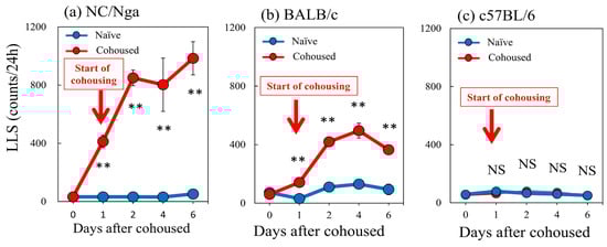 The LLS counts in the SPF-NC/Nga mice rapidly increased from 17.3 ± 3.1 counts/24 h to 412.7 ± 42.9 and 984.6 ± 113.8 counts/24 h at 1 and 6 days after cohousing with skin-lesioned NC/Nga mice, respectively (Figure 4a). The LLS counts in the BALB/c mice gradually increased from 60.3 ± 9.6 counts/24 h to 141.6 ± 18.9 and 364.8 ± 32.0 counts/24 h at 1 and 6 days after cohousing with skin-lesioned NC/Nga mice, respectively (Figure 4b). The LLS reached a steady state with approximately half the counts in the NC/Nga mice (Figure 4a,b, red line). The C57BL/6 mice showed no significant changes in LLS counts, which were 58.3 ± 6.2, 79.0 ± 6.5, and 51.0 ± 12.1 counts/24 h at 0, 1, and 6 days after cohousing, respectively (Figure 4c).