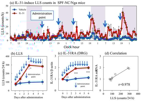 Effect of repeated administration of IL-31 on long-lasting scratching (LLS) counts and dorsal root ganglion (DRG) neuronal IL-31RA mRNA expression in SPF-NC/Nga mice. (a) LLS counts induced by repeated intradermal (i.d.) administration of IL-31 in NC/Nga mice. Repeated injection of IL-31 (1 μg/site, i.d.) every 12 h for 3 days gradually increased LLS counts, which increased intermittently after each dosage of IL-31. This increase in LLS counts showed a circadian rhythm; in particular, the LLS counts significantly increased at nighttime. Blue arrows indicate the administration points of vehicle or IL-31. Lateral axis indicates the clock hour, and the shaded area represents nighttime (7:00 pm to 7:00 am). (b) Effect of repeated administration of IL-31 on LLS counts for 6 days. (c) Effect of repeated administration of IL-31 on IL-31RA mRNA expression in the DRG. (d) Correlation between LLS counts and IL-31RA mRNA expression in the DRG (r = 0.978). Blue lines indicate vehicle (phosphate buffer solution, PBS)-administered mice, and red lines indicate IL-31 (1 μg/site, i.d., every 12 h for 3 days)-administered mice. Each value represents the mean ± standard error (S.E.) from six mice. NS, not significant. * p < 0.05, ** p < 0.01, and *** p < 0.001 compared with the respective values in the vehicle-administered group (Student’s t-test with Bonferroni collection).