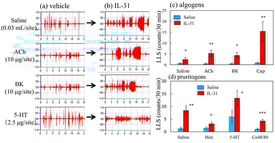Figure 6 shows traces of saline-, acetylcholine-, bradykinin-, and serotonin-induced scratching behavior 1 h after the intravenous injection of IL-31 in BALB/c mice. These stimulants elicited many SLS counts, and few LLS counts in the vehicle-treated mice (Figure 6a). In contrast, IL-31 pretreatment increased the LLS counts in the mice (Figure 6b). In the vehicle-treated mice, saline; algogens such as acetylcholine, bradykinin, and capsaicin; pruritogens such as histamine, serotonin; and compound 48/80 elicited SLS but not LLS (Figure 3c,d, blue column). At 1 h after IL-31 intravenous injection (50 μg/kg, i.v.), these LLS counts significantly increased as compared with those in the vehicle (phosphate buffer solution, PBS, 10 mL/kg) administered mice (Figure 6c,d, red column). These stimulants elicited scratching 5 min after the injection, and this behavior persisted for at least 30 min.