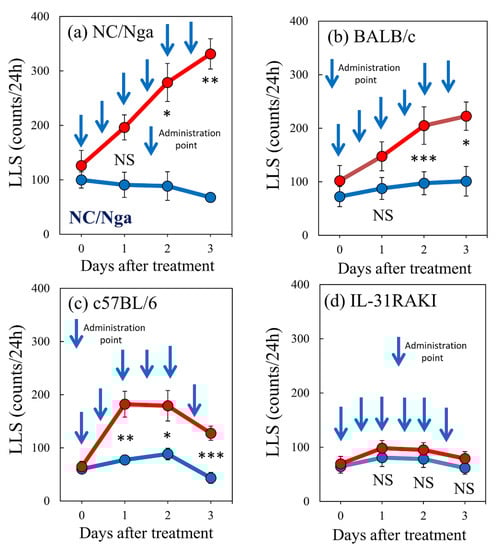 Subcutaneous administration of IL-31 (50 μg/kg, s.c.) every 12 h for 3 days increased the LLS counts. The LLS counts in the NC/Nga mice notably increased from 126.3 ± 27.6 counts/24 h to 196.3 ± 23.0 and 331.3 ± 27.8 counts/24 h at 1 and 3 days, respectively, after IL-31 pretreatment (Figure 7a). The LLS counts in the BALB/c mice gradually increased from 101.8 ± 28.6 counts/24 h to 147.5 ± 27.0 and 222.5 ± 26.5 counts/24 h at 1 and 3 days, respectively, after IL-31 pretreatment (Figure 7b). The LLS counts in the C57BL/6 mice rapidly increased from 64.3 ± 10.4 counts/24 h to 182.1 ± 24.3 and 127.5 ± 13.4 counts/24 h at 1, and 3 days, respectively, after IL-31 pretreatment (Figure 7c). The IL-31RA-deficient (IL-31RA knock-in mouse: IL-31RAKI) mice showed no significant changes in LLS counts, which were 69.3 ± 13.6, 80.8 ± 14.0, and 61.8 ± 12.8 counts/24 h at 0, 1, and 3 days, respectively, after IL-31 pretreatment, (Figure 7d). The LLS counts significantly differed between the NC/Nga, BALB/c, C57BL/6, and IL-31RAKI mice.