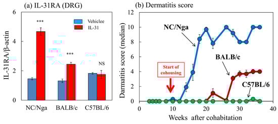 Comparison of IL-31-induced dorsal root ganglion (DRG) IL-31RA expression and dermatitis development between NC/Nga, BALB/c, and C57BL/6 mice. (a) Effect of repeated administration of IL-31 on IL-31RA mRNA expression in the DRG in NC/Nga, BALB/c, and C57BL/6 mice. Blue columns indicate vehicle (phosphate-buffered saline (PBS), 10 mL/kg, subcutaneous (s.c.), every 12 h for 3 days)-administered mice, and red columns indicate IL-31 (50 μg/kg, s.c., every 12 h for 3 days)-administered mice. (b) Differences in the development of dermatitis caused by cohousing with skin-lesioned NC/Nga mice (mite infestation) between SPF-NC/Nga, BALB/c, and C57BL/6 mice. Red arrow indicates the start of cohousing with skin-lesioned NC/Nga mice. Each value represents the mean ± standard error (S.E.) from a total of six mice. NS. not significant. *** p < 0.001 when compared with the respective value of vehicle-treated mice (Student’s t-test).
