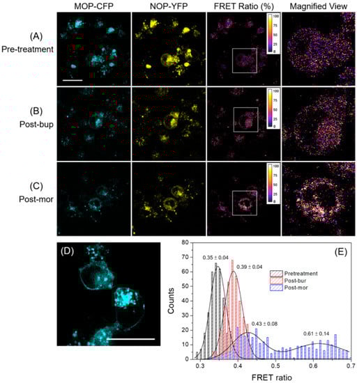 FRET serves as a sensitive indicator of cellular processes/activities occurring at the nanoscale and has been used to identify the supramolecular organization of cell surface molecules, receptor protein interactions on the cell membrane (i.e., membrane mapping), intermolecular interactions in live cells, etc. [37,38]. The main reason for using two-photon microscopy was the usage of a near infrared laser, which provides less photodamage and photobleaching compared to experiments using visible laser light at the same power level. Thus, two-photon microscopy enables long-term observation, as required in our experiment. However, the fluorescence signals from the transfected cells containing MOP-CFP and NOP-YFP were quite low, resulting in the laser power at the sample site being approximately 25 mW in our case, which was ranked as a high-power level. Thus, special attention should be given to the balance between image quality, laser power, and photo-damage/bleaching prior to FRET measurements. With two-photon FRET imaging, cellular behaviors responding to a natural or controlled environment can be resolved noninvasively and in real time. First, it was used to study the proximity of MOP and NOP receptors under three different experimental conditions, including pre-treatment as a control, treatment with buprenorphine (post-bur), and treatment with morphine (post-mor). The results are illustrated in Figure 1A–C, showing images obtained from the MOP-CFP-channel, NOP-YFP-channel, FRET ratio counted from the above two, and a magnified view from a white square region on the respective FRET ratio image, from left to right for each condition. Notably, the control image shown in Figure 1D (obtained from the MOP-CFP-channel at the pretreatment condition) provides a representative appearance of the receptors properly expressed on the cell surface, which is the basis of determining a suitable cell status for the subsequent analysis.