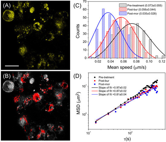 With the obtained trajectories, we then analyzed the mean speed in the three conditions. As shown in Figure 2C, the fastest motion was found in the pre-treatment condition, followed by the post-bur and post-mor conditions, indicating that the motion in the post-bur and post-mor conditions was more confined than in pre-treatment and was influenced by drug inclusion, in which an increased force occurred between heterodimer and cell membrane. Notably, the mean speed of the heterodimers (~20 nm in diameter) in the pre-treatment condition was much slower than that of 1 µm diameter particles in a liquid (~1 µm/s) [42], indicating that the intracellular force persisted without drug treatment. On the other hand, the 2D MSDs were calculated according to Equation 2 and were then analyzed to extract the exponent and diffusion coefficient shown by Equation (3). For simplicity, we transformed the MSD-time lag dependency into a log-log plot, as shown in Figure 2D, which enabled the extraction of the above parameters simply using a linear fit. The slope indicated the exponent of Equation 3 used to distinguish between directed motion (1 < α < 2), Brownian motion (α = 1), and confined motion (α < 1) [43,44]. The results showed that heterodimers in the pre-treatment (α = 0.97 ± 0.02), post-bur (α = 0.87 ± 0.02), and post-mor (α = 0.81 ± 0.04) conditions all exhibited confined motion, in which the diffusion coefficients measured at the second time scale were 0.021 ± 0.006, 0.012 ± 0.003, and 0.007 ± 0.003 μm2/s, respectively. By comparing the post-bur with post-mor condition results, the post-mor condition had a smaller α and diffusion coefficient, implying that the enhancement of the FRET ratio caused by the colocalization of MOP and NOP induced by opioids hindered the motion of the heterodimers.
