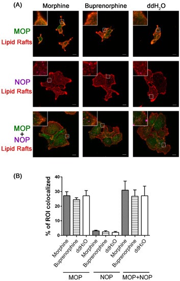 Lipid rafts were labeled using the Vybrant® Lipid Raft Labeling Kit (Thermo Fisher Scientific) with modifications. Briefly, HEK 293 cells stably expressing HA-tagged MOP and/or myc-tagged NOP [36] were seeded on sterile coverslips placed in 12-well culture dishes two days before the immunocytochemical assay. Cells were incubated with 1 μM morphine, buprenorphine, or vehicle (ddH2O) in the presence of 1 μg/mL (diluted in growth media) Alexa Fluor 555-labeled cholera toxin subunit B (CT-B) for 20 min at 4 °C. This CT-B conjugate bound to the pentasaccharide chain of plasma membrane ganglioside GM1 that selectively partitioned into lipid rafts. Subsequently, the cells were gently washed with chilled PBS and then incubated with rabbit anti-CT-B antibody for 30 min at 4 °C to crosslink the CT-B-labeled lipid rafts with the anti-CT-B antibody. After this incubation, the cells were gently washed with chilled PBS containing 1 mM MgCl2 and 0.1 mM CaCl2 (PBS+), fixed in freshly prepared 4% paraformaldehyde (in PBS+) for 30 min at 4 °C, washed again in PBS+, and permeabilized with 0.2% Triton X-100 in PBS+ for 15 min at room temperature. After washing with PBS+, the cells were blocked with 10% BSA in PBS+ for 30 min at room temperature, and immunostaining was performed by incubating the cells with a 1:100 dilution of HA-Tag (6E2) mouse monoclonal antibody (Cell Signaling Technology, Danvers, MA, USA) or c-Myc Tag chicken polyclonal antibody (Thermo Fisher Scientific) in 10% BSA in PBS+ overnight at 4 °C. The secondary antibody (1:500 dilution of Alexa Fluor 488 goat anti-mouse [Thermo Fisher Scientific] or Alexa Fluor 647 donkey anti-chicken IgY antibody [Millipore]) was applied for 2 h at room temperature. The cells were then washed with PBS+, mounted onto microscope slides with a ProLong® Gold Antifade Kit (Thermo Fisher Scientific), and visualized using a Leica TCS SP8 X Confocal Spectral Microscope Imaging System with White Light Laser (Leica Microsystems, Wetzlar, Germany). Analysis of the degree of colocalization between lipid rafts and MOP or NOP immunoreactivity was performed using Imaris software (Bitplane, Zurich, Switzerland) [65]. Lipid rafts labeled by red fluorescence were defined as the ROI. Localization of the MOP and NOP receptors on the ROI was identified using the mono-color layers, i.e., the Alexa Fluor 488 and Alexa Fluor 647 layers, respectively. Colocalization coefficients were then calculated using the proprietary module of Imaris software. Statistical analysis was performed using Prism software (GraphPad Software, La Jolla, CA, USA).