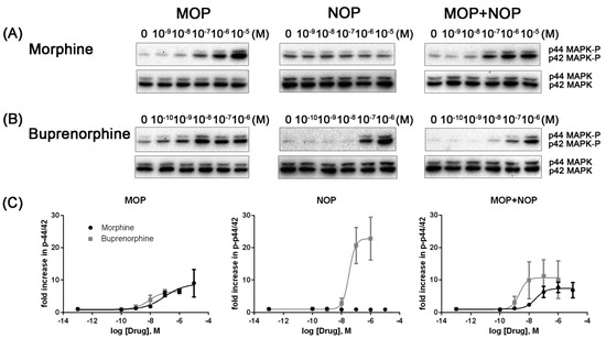 HEK 293 cells harboring HA-tagged MOP and/or myc-tagged NOP [36] were grown to near confluence in 6-well plates, serum-starved for 16 h, and then incubated with various concentrations of morphine or buprenorphine for 10 min at 37 °C in a humidified 5% CO2 incubator. After being washed twice with ice-cold phosphate-buffered saline (PBS), cells were lysed in lysis buffer containing 50 mM Tris-HCl (pH 7.5), 150 mM NaCl, 1 mM MgCl2, 0.25% sodium deoxycholate, 0.2% Triton X-100, 10% glycerol, 2 mM NaF, 1 mM dithiothreitol, 0.5 mM phenylmethylsulfonyl fluoride, 0.2 mM sodium pyrophosphate, 1 mM sodium orthovanadate, and 1% protease inhibitor mixture (Sigma-Aldrich, St. Louis, MO, USA) for 15 min at 4 °C. Cell debris was precipitated by centrifugation at 14,000× g for 10 min at 4 °C, and the supernatant was used for the analysis. The protein concentration of the supernatant was determined using the PierceTM BCA assay (Thermo Fisher Scientific, Waltham, MA, USA) with bovine serum albumin as the standard. Proteins were resolved using 10% SDS polyacrylamide gels in duplicate and then transferred to polyvinylidene difluoride membranes. Membranes were incubated with anti-phospho-p44/p42 MAPK (Erk1/2) (Thr202/Tyr204) rabbit polyclonal or anti-p44/42 MAPK (Erk1/2) (137F5) rabbit monoclonal antibody (Cell Signaling Technology, Danvers, MA, USA) overnight at 4 °C. After being washed, the membrane was incubated with Amersham donkey anti-rabbit horseradish peroxidase-linked secondary antibody (GE Healthcare, Little Chalfont, Buckinghamshire, UK). Subsequently, immunoreactive proteins on the membrane were revealed by enhanced chemiluminescence (SuperSignalTM West Pico chemiluminescent substrate; Thermo Fisher Scientific). Images were captured using Image LabTM Software (Bio-Rad, Hercules, CA, USA). The intensities of the bands on the immunoblots were quantified using Image LabTM software (Bio-Rad), and then a four-parameter dose–response curve was applied to determine the pEC50 of the drug using Prism 6 software (GraphPad Software, San Diego, CA, USA).