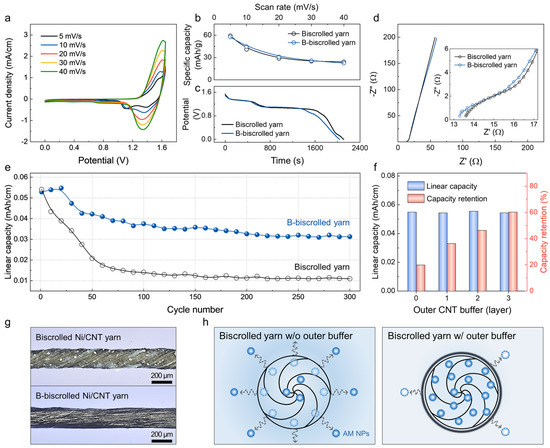 Electochemical characterizations of the BNF yarn batteries. (a) CV curves of b—BNF yarn battery in aqueous 6M KOH at different scan rates. (b) Average specific capacity as a function of the scan rate, (c) galvanostatic discharge curves at 0.1 mA/cm, (d) Nyquist plots (from 10 Hz to 100 kHz), and (e) cycling stability of BNF and b—BNF yarn batteries at 0.1 mA/cm. Inset in d shows enlarged section of Nyquist plots. (f) Dependence of linear capacity and capacity retention on outer CNT buffer layer. (g) Optical images show biscrolled Ni/CNT yarn (top) and b—biscrolled Ni/CNT yarn (bottom). (h) Schematics show the expected AM NP desorption process (indicated by arrows) of the biscrolled yarns without (left) and with (right) an outer CNT buffer layer in an aqueous electrolyte.