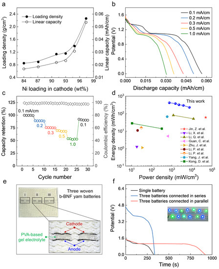 In this work, the amount of AMs in the yarn was controlled by altering their dispersion concentrations; this resulted in a volumetric loading density and corresponding linear capacity of 2.26 g/cm3 and 0.053 mAh/cm, respectively (Figure 3a). This high load can be ascribed to the strong compressive forces generated by the inserted twists [33]. The galvanostatic discharge curves measured at different current densities (from 0.1 to 1 mA/cm) and the corresponding capacity retention rate against the number of charge/discharge cycles are presented in Figure 3b and Figure 3c, respectively. All curves display distinct discharge voltage plateaus at approximately 1.1 V, which are consistent with the CV curves in Figure 2a. This b–BNF yarn battery exhibited a high linear capacity of 0.053 mAh/cm at 0.1 mA/cm current density and 0.031 mAh/cm at 1 mA/cm current density, thereby indicating its good rate capability. In addition, the coulombic efficiency was approximately 100% during rate cycling; hence, the battery is a feasible power supply [40,43,44]. More importantly, when the total volume of the cathode and anode is considered, our b–BNF yarn battery yielded an incredibly high energy density of 422 mWh/cm3 at 753 mW/cm3 power density. Even at 7535 mW/cm3, the energy density was 229 mWh/cm3. Thus, the proposed b–BNF yarn battery outperforms most previously reported Ni–Fe batteries (Figure 3d) [45,46,47,48,49,50,51,52,53].