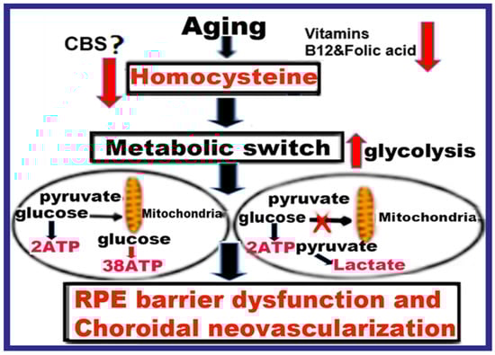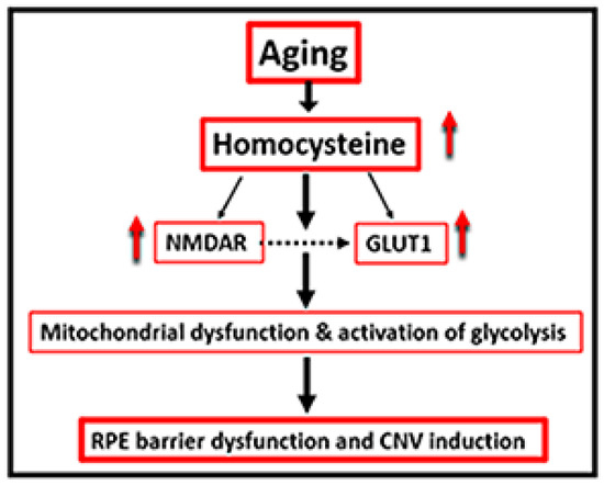 Age-related macular degeneration (AMD) is the most commonly known cause of vision loss in people over 60 [1]. AMD mainly affects their central vision, in which patients cannot see things directly in front of them. There are two types of disease: dry-type AMD, which leads to gradual visual impairment, and wet-type AMD, which tends to cause a rapid loss of vision [1,2]. Eleven million new cases are diagnosed in the United States (USA) every year [3]. Therefore, AMD is the main cause of visual disability in developed countries and the third globally [4]. The low quality of life of AMD patients and high treatment costs make it urgent to find a new therapy for AMD. Anti-(vascular endothelial growth factor) VEGF therapy has made important progress in treating the wet form of AMD by targeting the abnormally formed blood vessels, but these patients still exhibit a progression of the disease and do not regain vision despite treatments. Over the last fifteen years, Hyperhomocysteinemia (HHcy) has gained special consideration in many AMD studies, which suggest an association between HHcy and AMD [5,6,7,8]. Furthermore, Over the past several years, we have conducted experiments aimed to address this issue. Earlier studies reported a direct impact of excess homocysteine (Hcy) on (retinal pigment epithelium) RPE structure, barrier function, and induced choroidal neovascularization (CNV) in mice [9], and subsequent experiments reported that HHcy not only increased hypoxia-inducible factor 1 (HIF-1α) and VEGF levels in retinas [10,11], but also angiogenic potential of retinal endothelial cells in vitro and in vivo [10,12,13]. These findings were followed by many mechanistic studies that showed that HHcy activates oxidative stress [12], endoplasmic reticulum (ER) stress [14], inflammation [15], and epigenetic modifications [16]. Recently, we reported activation of the N-methyl-d-aspartate (NMDA) receptor in retinal endothelial cells [17] and in RPE [11] cells as a suggested mechanism of HHcy-induced retinal dysfunction. Our goal is to understand the exact mechanism by which HHcy participates in the pathogenesis of AMD; accordingly, we can propose Hcy as a marker and therapeutic target for AMD.