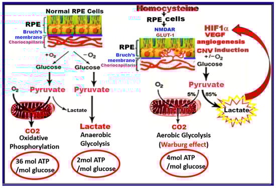Age-related macular degeneration (AMD) is a major cause of blindness. Recent studies have reported impaired glycolysis in AMD patients with a high lactate/pyruvate ratio. Elevated homocysteine (Hcy) (Hyperhomocysteinemia, HHcy) was observed in several clinical studies, reporting an association between HHcy and AMD. We established the effect of HHcy on barrier function, retinal pigment epithelium (RPE) structure, and induced choroidal neovascularization (CNV) in mice. We hypothesize that HHcy contributes to AMD by inducing a metabolic switch in the mitochondria, in which cells predominantly produce energy by the high rate of glycolysis, or “Warburg”, effect. Increased glycolysis results in an increased production of lactate, cellular acidity, activation of angiogenesis, RPE barrier dysfunction, and CNV. Evaluation of cellular energy production under HHcy was assessed by seahorse analysis, immunofluorescence, and western blot experiments. The seahorse analysis evaluated the extracellular acidification rate (ECAR) as indicative of glycolysis. HHcy showed a significant increase in ECAR both in vivo using (Cystathionine β-synthase) cbs+/− and cbs−/− mice retinas and in vitro (Hcy-treated ARPE-19) compared to wild-type mice and RPE cells. Moreover, HHcy up-regulated glycolytic enzyme (Glucose transporter-1 (GlUT-1), lactate dehydrogenase (LDH), and hexokinase 1 (HK1)) in Hcy-treated ARPE-19 and primary RPE cells isolated from cbs+/+, cbs+/−, and cbs−/− mice retinas. Inhibition of GLUT-1 or blocking of N-methyl-D-aspartate receptors (NMDAR) reduced glycolysis in Hcy-treated RPE and improved albumin leakage and CNV induction in Hcy-injected mice eyes. The current study suggests that HHcy causes a metabolic switch in the RPE cells from mitochondrial respiration to glycolysis during AMD and confirms the involvement of NMDAR in this process. Therefore, targeting Glycolysis or NMDAR could be a novel therapeutic target for AMD.